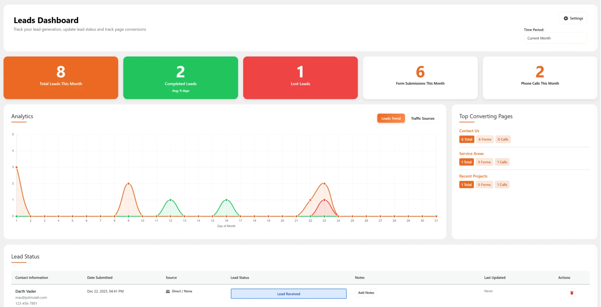Know Your ROI, Instantly. Stop guessing where your leads come from. Our integrated dashboard tracks and aggregates every single lead from forms and phone clicks, giving you a clear, centralized view of your marketing performance and customer journey.